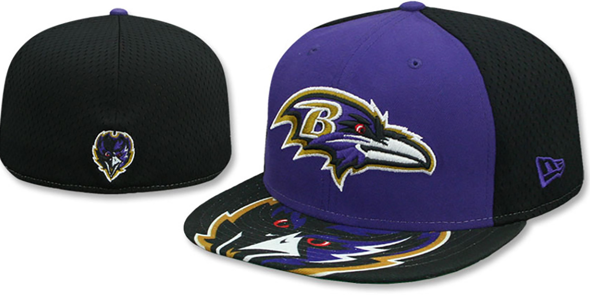 This New Era 59FIFTY fitted hat features an authentic, original design. The front panels are made of purple poly material, while the middle and back panels are black mesh with batting practice holes. The black visor has a printed oversized alternate team logo and a kelly green undervisor. A black sweatband lines the interior. The front of the hat displays a raised, embroidered team logo, with a matching embroidered New Era logo on the opposite side. The back of the hat also has a matching embroidered alternate team logo in the team's colors. This Baltimore Ravens baseball cap is made by New Era and is licensed by the NFL - National Football League.
