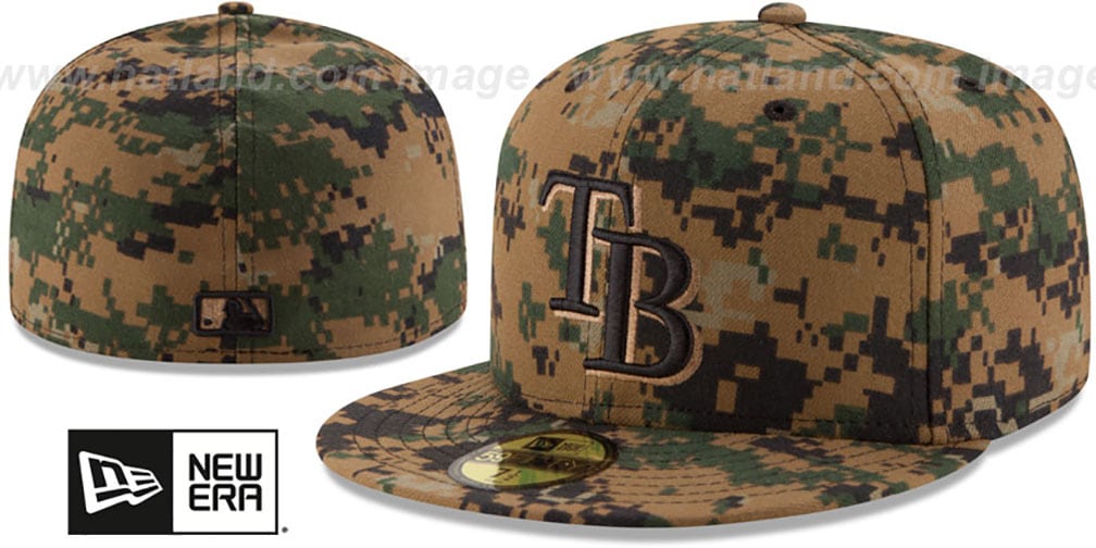 Authentic and ORIGINAL 59FIFTY fitted performance poly hat by New Era, DIGITAL army (woodland) camouflage deep crown and visor with light grey undervisor, raised embroidered 2016 Memorial Day team logo on front, matching MLB logo on back, This is the style of Onfield hat worn by all MLB teams played on Memorial Day in 2016. These commemorative caps honor our Armed Forces through patriotic themes that remind us all of the dedication of our troops. A portion of proceeds from the sale of 'Stars & Stripes' caps support the Welcome Back Veterans Fund, an organization that provides support to veterans and their families when they come home from war.EACH CAMO HAT PATTERN WILL BE SLIGHTLY DIFFERENT SO NO TWO HATS WILL BE THE SAME. This Tampa Bay Rays baseball cap is made by New Era and is licensed by the MLB - Major League Baseball.
