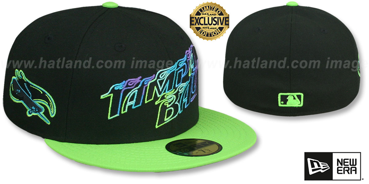 Introducing the MLB Authentic Collection's ORIGINAL 59FIFTY fitted performance poly hat by New Era! This eye-catching piece features a sleek black crown, a vibrant lime green visor, and a light grey undervisor. The headband is bold black, and the front boasts an embroidered City Connect TAMPA BAY design in a dazzling array of colors. Complementing the front is the iconic New Era logo embroidered on the side, with a matching City Connect logo on the opposite side. To top it off, the back showcases a raised, embroidered MLB logo in the same striking colors. This energetic, high-performance hat is a must-have for any passionate baseball fan!. This Tampa Bay Rays baseball cap is made by New Era and is licensed by the MLB - Major League Baseball.