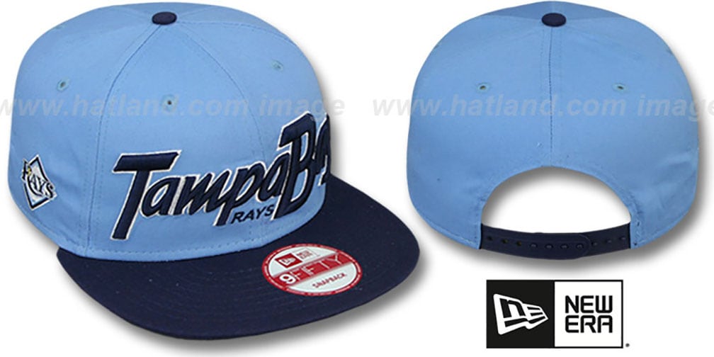 Original fit 9FIFTY adjustable cotton hat by New Era with deep crown and flat brim, sky (light)blue crown and navy blue visor with green undervisor, raised embroidered team city script on front, embroidered team logo on side, secondary color plastic adjustable strap. This item is on SALE!. This item is on SALE!. This Tampa Bay Rays hat is made by New Era and is licensed by the MLB - Major League Baseball.