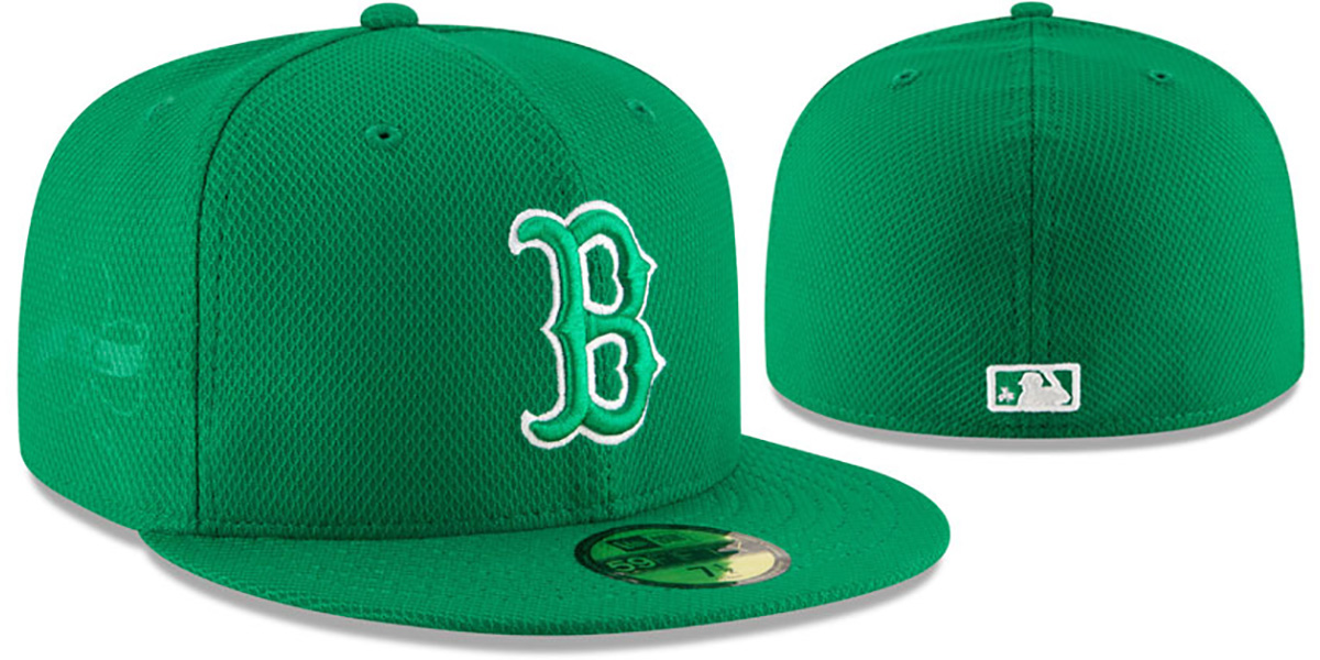 Authentic and ORIGINAL 59FIFTY fitted diamond tech batting practice poly hat by New Era, kelly green deep crown and visor with light grey undervisor, raised embroidered team logo on front, Shamrock and AL print on side panel, matching raised embroidered MLB logo on back with shamrock inside logo, This is the style of On-field hat worn by all MLB teams played on March 17, 2016. This Boston Red Sox baseball cap is made by New Era and is licensed by the MLB - Major League Baseball.