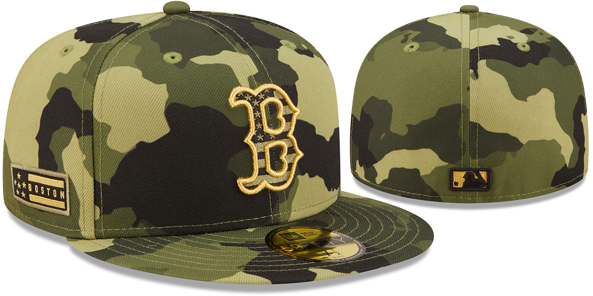 Authentic and ORIGINAL 59FIFTY fitted performance poly hat by New Era, green camo crown and visor with black undervisor, raised embroidered 2022 Armed Forces Day team logo on front in metallic gold with black and olive USA flag fill, embroidered 6 star patch on side with city in metallic gold and black, New Era logo on opposite side in metallic gold, matching MLB logo on back, This is the Onfield hat worn by all MLB teams in games played during the 2022 Armed Forces weekend. These commemorative caps honor our Armed Forces through patriotic themes that remind us all of the dedication of our troops. A portion of proceeds from the sale of 'Stars & Stripes' caps support the Welcome Back Veterans Fund, an organization that provides support to veterans and their families when they come home from war. EACH CAMO HAT PATTERN WILL BE SLIGHTLY DIFFERENT SO NO TWO HATS WILL BE THE SAME. This Boston Red Sox baseball cap is made by New Era and is licensed by the MLB - Major League Baseball.