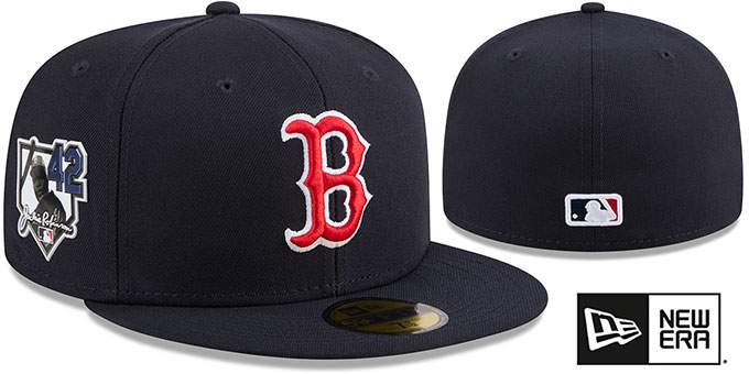 MLB Authentic Collection and ORIGINAL 59FIFTY fitted hat by New Era, navy blue authentic poly crown and visor, kelly green undervisor with 42 in black, Jackie Robinson picture and stats on the inside front panels, raised embroidered Cooperstown team logo on front, embroidered New Era logo on side, rubberized Jackie Robinson homeplate patch on opposite side, raised embroidered MLB logo on back in team colors, This is the style of Onfield hat worn by all MLB teams during the 2026 MLB Jackie Robinson Day. This Boston Red Sox baseball cap is made by New Era and is licensed by the MLB - Major League Baseball.