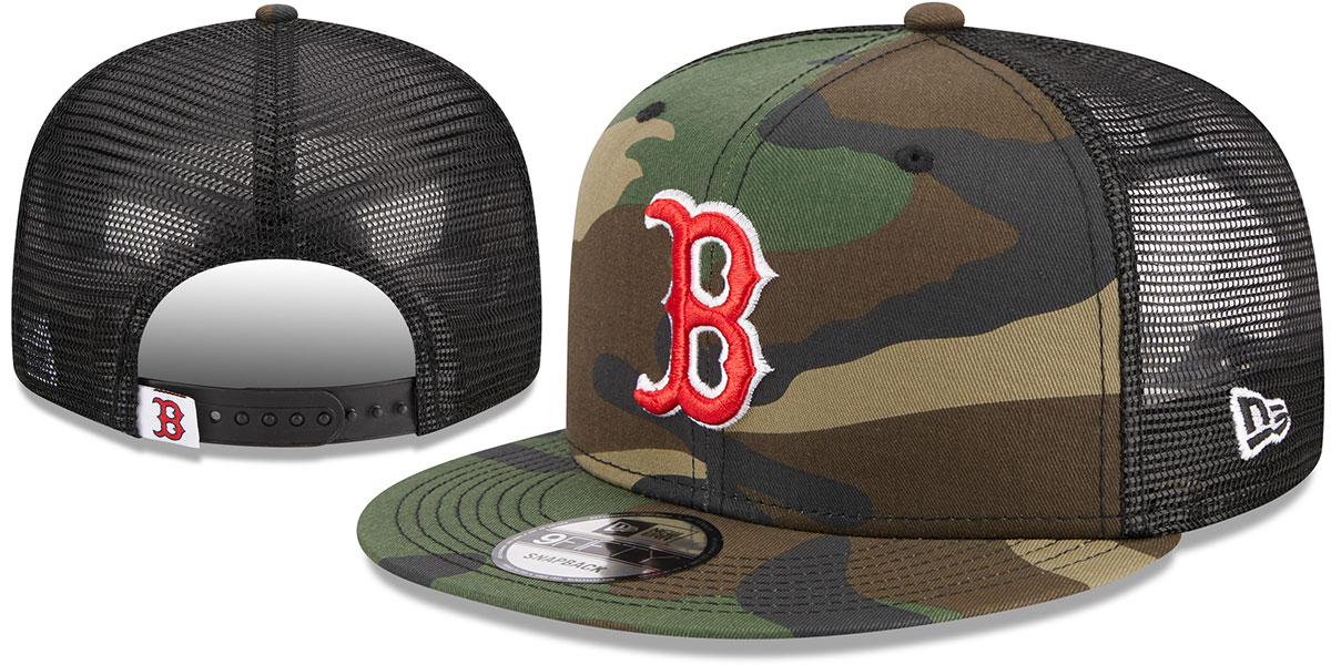 Original 9FIFTY fit adjustable poly meshback hat by New Era that has similar deep crown and flat brim fit as the 59-Fifty, army (woodland) camo cotton front panels and visor with black mesh middle and back panels, light grey undervisor, raised embroidered team logo on front in team colors, embroidered white New Era logo on side, black adjustable snapback closure with team logo hangtag. This Boston Red Sox hat is made by New Era and is licensed by the MLB - Major League Baseball.