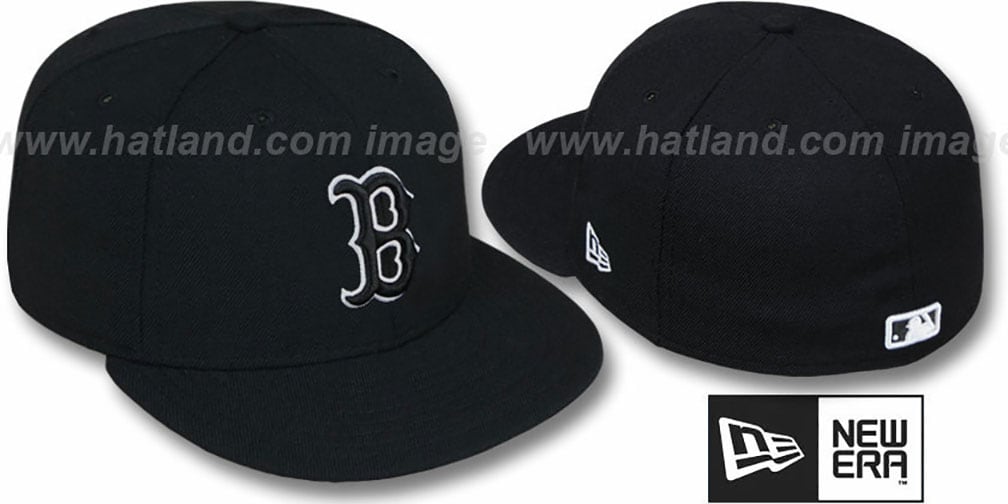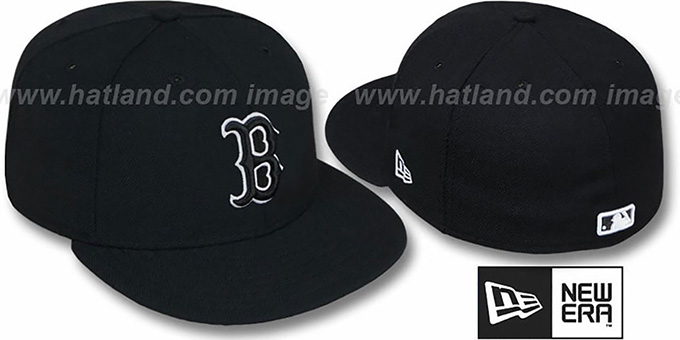 Authentic fitted hat by New Era with '59FIFTY Authentic Collection' fit, black wool deep crown and visor, black raised embroidered 'B' logo with white outline on front, matching MLB logo on back. This Boston Red Sox baseball cap is made by New Era and is licensed by the MLB - Major League Baseball.
