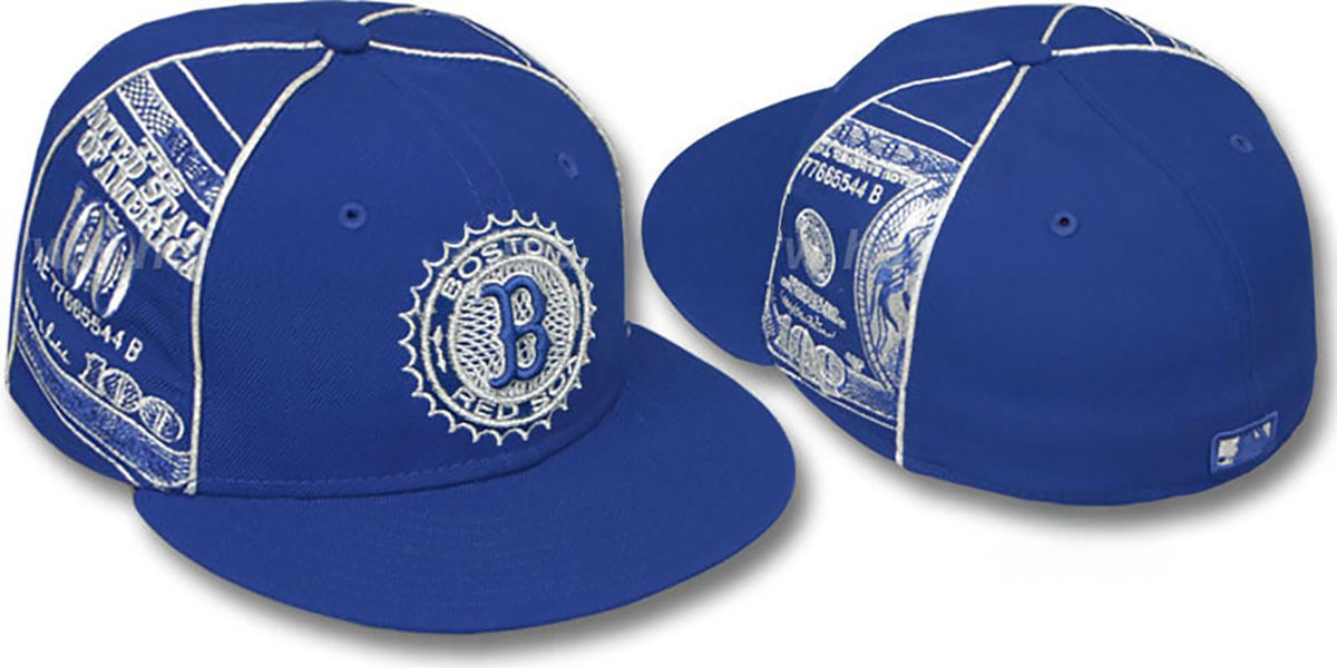 'Authentic' and Original 59FIFTY fitted hat by New Era, royal blue wool deep crown and visor, metallic silver embroidered New Era Exclusive 'C-Note' $100 bill design on mid panels, metallic silver piping on mid seams, raised embroidered metallic silver seal on front with team logo inside seal, matching MLB logo on back. This Boston Red Sox baseball cap is made by New Era and is licensed by the MLB - Major League Baseball.
