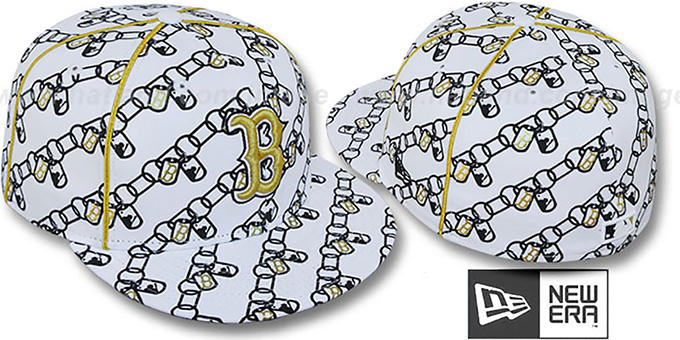 'Authentic' and ORIGINAL 59FIFTY fitted hat by New Era, white cotton twill deep crown and visor with chain link print in black All-Over deep crown and visor with team logos in gold inside link, metallic gold piping on mid seams, metallic gold raised embroidered team logo on front with outlines, matching embroidered MLB logo on back. This Boston Red Sox baseball cap is made by New Era and is licensed by the MLB - Major League Baseball.