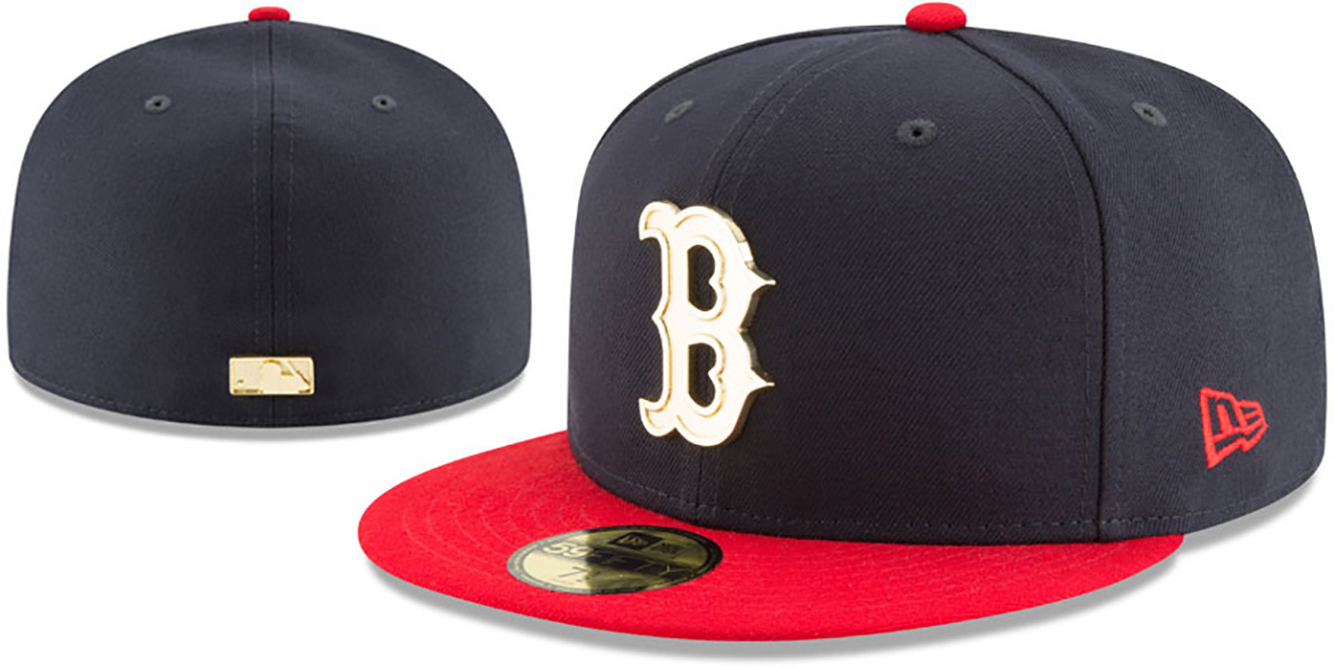 Authentic and ORIGINAL 59Fifty fitted hat by New Era, navy blue authentic poly deep crown and red visor, light grey undervisor, gold metal badge team logo attached to front, matching embroidered New Era logo on side, matching gold metal badge MLB logo on back . This Boston Red Sox hat is made by New Era and is licensed by the MLB - Major League Baseball.