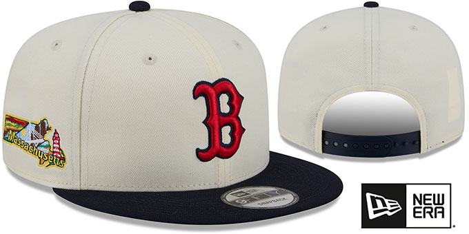Original 9FIFTY adjustable poly hat by New Era that has similar deep crown and flat brim fit as the 59-Fifty, chrome (cream off white) crown with navy blue visor, kelly green undervisor, raised embroidered team logo on front in team colors, embroidered New Era logo on side, embroidered Localized Massachusetts state logo on side, team color adjustable Snapback closure. This Boston Red Sox hat is made by New Era and is licensed by the MLB - Major League Baseball.