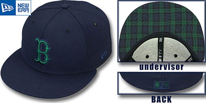 Authentic and ORIGINAL 59Fifty wool fitted hat by New Era, navy and green plaid undervisor, navy blue wool deep crown and visor, forest green raised embroidered team logo on front with navy outline, matching MLB logo on back in navy and green. This Boston Red Sox hat is made by New Era and is licensed by the MLB - Major League Baseball.