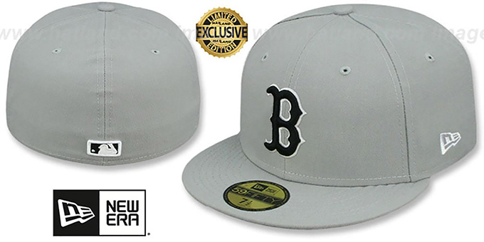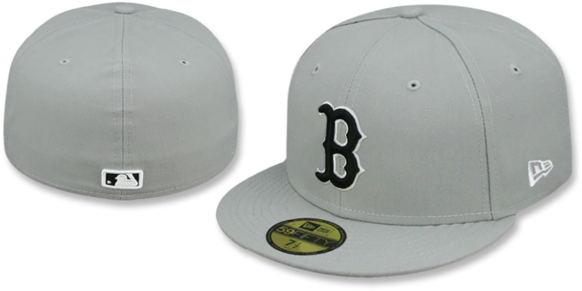 Authentic and ORIGINAL 59FIFTY fitted hat by New Era, light grey authentic poly deep crown and visor, light grey undervisor, raised embroidered team logo on front in black with white outline, raised embroidered matching MLB logo on back. This Boston Red Sox baseball cap is made by New Era and is licensed by the MLB - Major League Baseball.