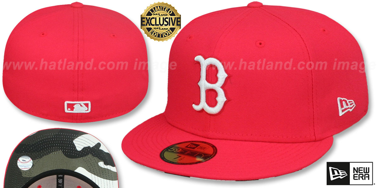 Authentic and ORIGINAL 59Fifty fitted hat by New Era, lava (light bright) red authentic poly crown and visor with urban camouflage (black, white, light grey, dark grey) cotton undervisor, raised embroidered team logo on front in white, embroidered New Era flag on side in white, white raised embroidered MLB logo on back, URBAN CAMO UNDERVISOR PATTERN WILL BE SLIGHTLY DIFFERENT SO NO TWO HATS WILL BE THE SAME. This Boston Red Sox hat is made by New Era and is licensed by the MLB Major League Baseball.
