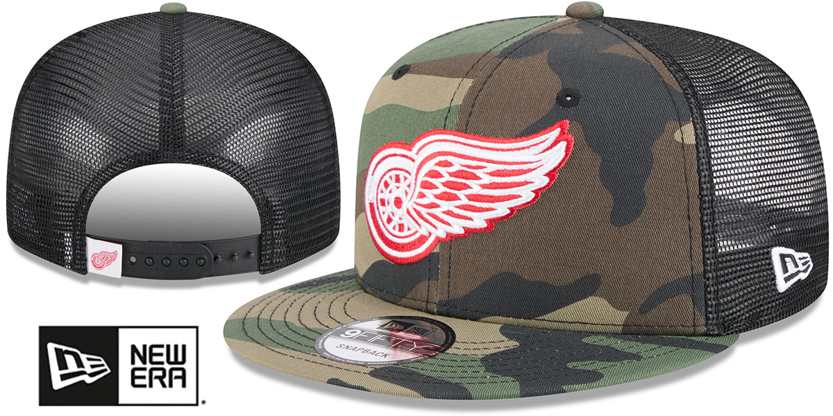 Original 9FIFTY fit adjustable poly meshback hat by New Era that has similar deep crown and flat brim fit as the 59-Fifty, army (woodland) camo cotton front panels and visor with black mesh middle and back panels, light grey undervisor, raised embroidered team logo on front in team colors, embroidered white New Era logo on side, black adjustable snapback closure with team logo hangtag. This Detroit Red Wings hat is made by New Era and is licensed by the NHL - National Hockey League.