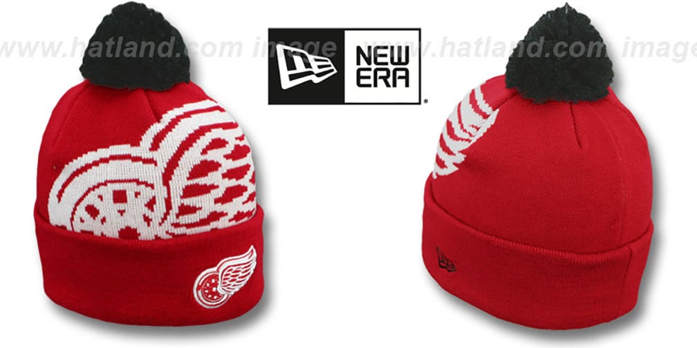 Cozy up in this electrifying 100% acrylic knit beanie! Featuring your team's bold red color, a ribbed cuff with an embroidered logo, and a large printed team logo on the crown. Plus, an embroidered New Era flag and a pom-pom in the opposite team color - this hat is a game-day essential that's on SALE now!. This Detroit Red Wings hat is made by New Era and is licensed by the NHL - National Hockey League.