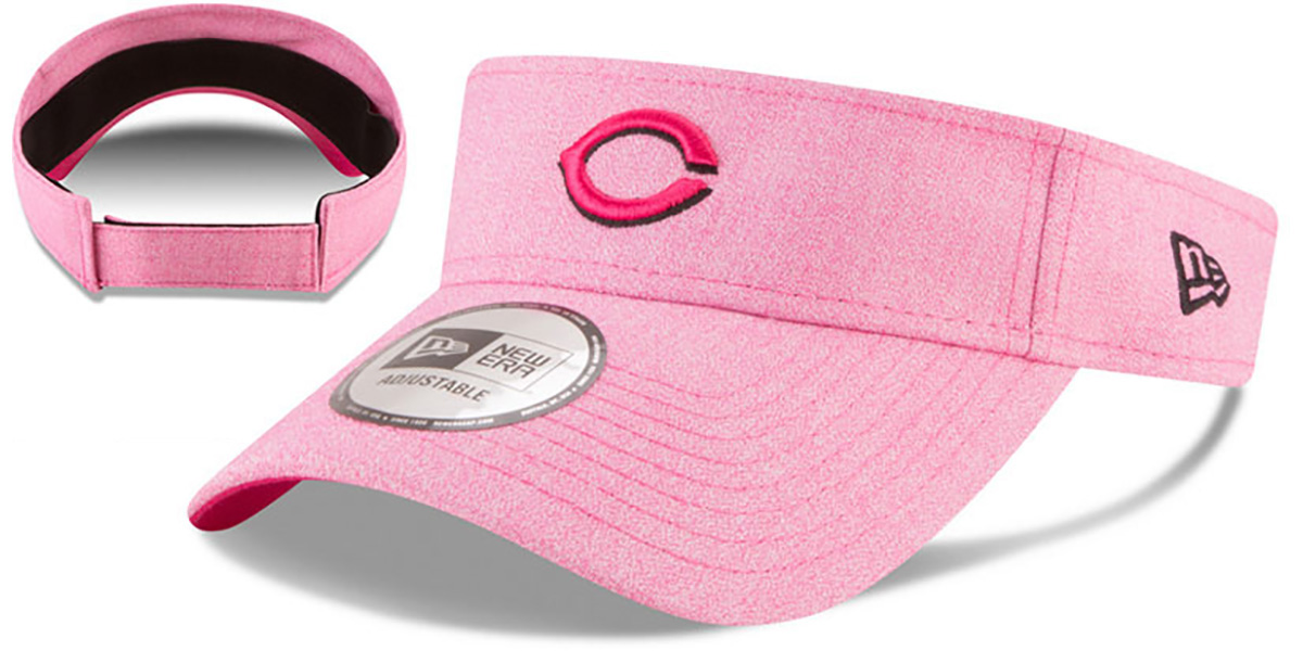 New Era adjustable visor with heather pink poly blend rise and top of brim, rose pink undervisor, matching raised embroidered team logo on front, New Era logo on side, velcro strap back closure. This Cincinnati Reds merchandise is made by New Era and is licensed by the MLB - Major League Baseball.