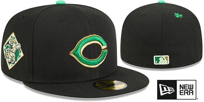 Authentic and ORIGINAL 59FIFTY fitted hat by New Era, black authentic poly crown and visor, black undervisor, green and black plaid inside crown on front panels, raised embroidered team logo on front in kelly green, gold and off white, matching embroidered diamond side patch with team logo and shamrock print, matching embroidered New Era logo on opposite side, kelly green embroidered shamrock on backside top of crown, matching raised embroidered MLB logo on back, This is the style of On-field hat worn by all MLB teams in the 2026 ST PATRICKS DAY games. This Cincinnati Reds baseball cap is made by New Era and is licensed by the MLB - Major League Baseball.