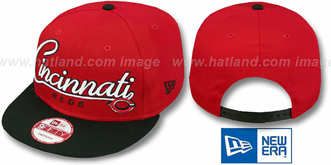 Authentic cotton twill 9FIFTY adjustable hat by New Era with original cut and flat brim, red crown and black visor, light grey undervisor, raised embroidered team-script city on front with small raised embroidered team logo on side front, embroidered New Era logo on side, alternate team color adjustable plastic Snapback strap. This Cincinnati Reds hat is made by New Era and is licensed by the MLB - Major League Baseball.