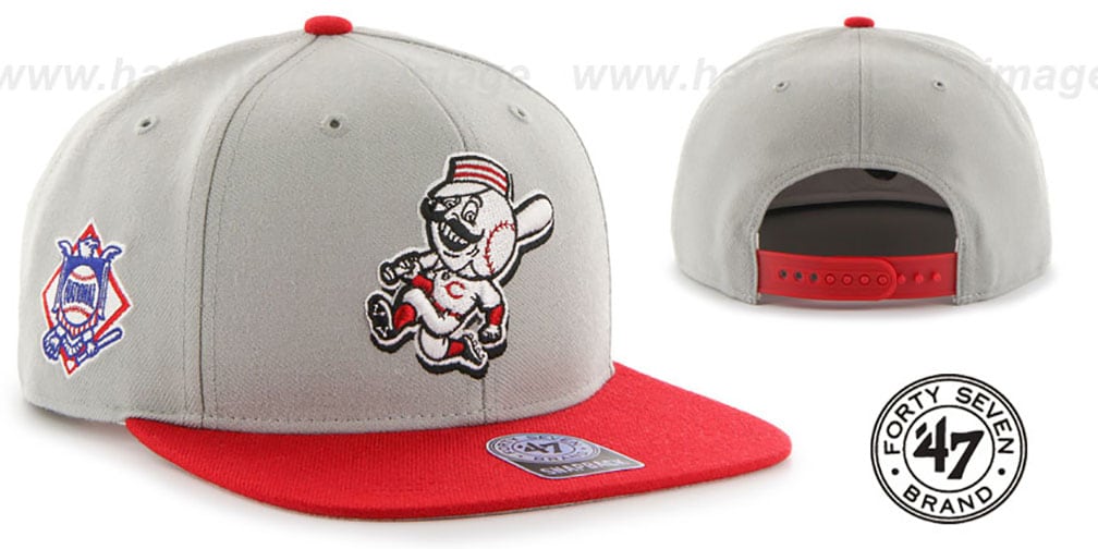 Authentic wool blend adjustable hat by Twin 47 Brand with original cut and flat brim, grey crown and red visor, light grey undervisor, raised embroidered team logo on front, league logo embroidered on side, matching adjustable plastic Snapback strap closure. This Cincinnati Reds hat is made by 47 Brand and is licensed by the MLB - Major League Baseball.