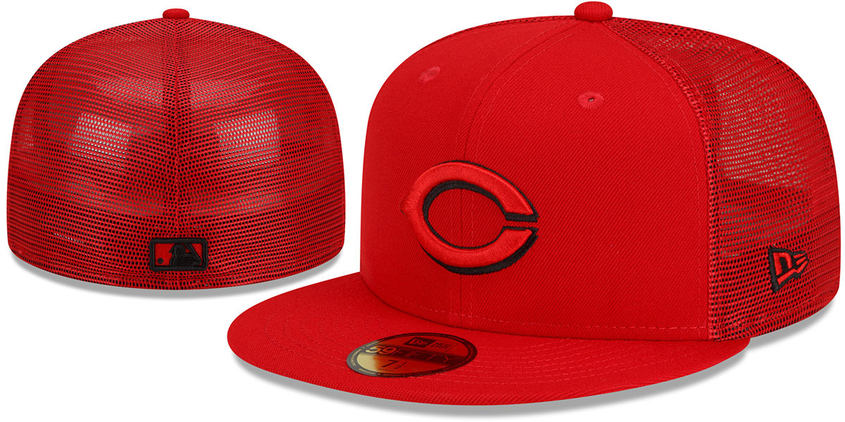Authentic and ORIGINAL 59FIFTY fitted hat by New Era, team color red authentic poly front panels and visor, red trucker mesh middle and back panels, light grey undervisor, raised embroidered team logo on front in team colors, matching embroidered New Era logo on side, matching raised embroidered team color MLB logo on back, This is the MLB Official hat worn in Batting Practice during the 2022-23 MLB seasons. This Cincinnati Reds baseball cap is made by New Era and is licensed by the MLB - Major League Baseball.
