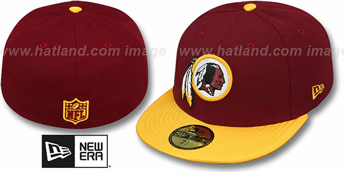 Authentic and ORIGINAL 59Fifty fitted hat by New Era, burgundy authentic poly deep crown with the high tech fabric that has revolutionary wicking ability, superior drying, and is shrink resistant, team color gold dazzle jersey material visor and matching cotton undervisor, raised embroidered team logo on front, raised embroidered NFL shield logo on back. This Washington Redskins hat is made by New Era and is licensed by the NFL National Football League.