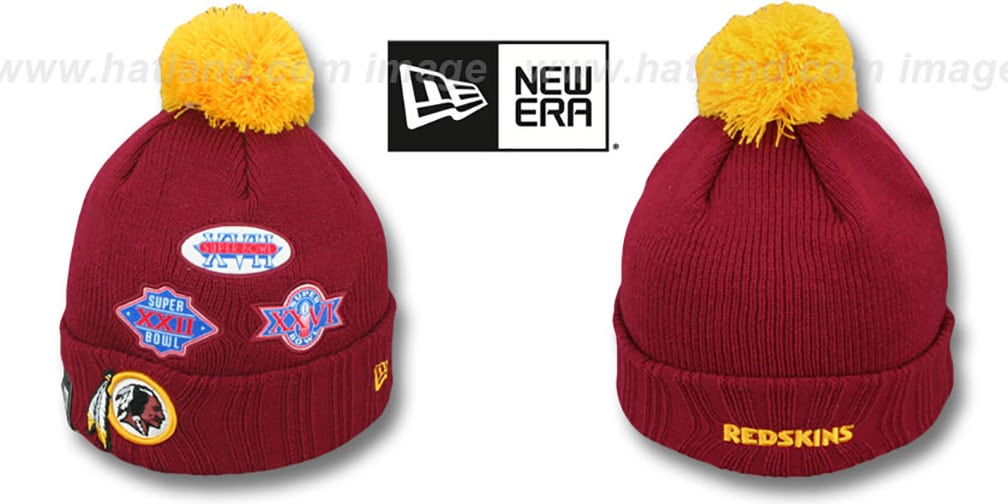 burgundy acrylic knit beanie with ribbed cuff, raised embroidered team logo on front of cuff, three embroidered official Super Bowl logos on crown from the years winning the NFL Championship, embroidered New Era Flag on side, matching emboidered team font and logo on back, matching opposite team color pom-pom. This item is on SALE!. This Washington Redskins hat is made by New Era and is licensed by the NFL National Football League.