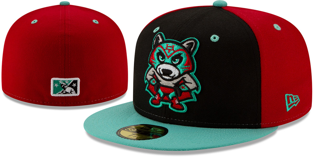 Authentic and ORIGINAL 59FIFTY onfield poly fitted hat by New Era, black front panels with red middle and back panels and light mint green visor, black undervisor, embroidered Hudson Valley Renegades Minor League New Era EXCLUSIVE COPA Fenómenos Enmascarados del Valle de Hudson team logo on front, New Era logo on side, matching raised embroidered MiLB Minor League logo on back, These hats will be worn during select Minor League games. This Hudson Valley Renegades baseball cap is made by New Era and is licensed by the MiLB - Minor League Baseball.