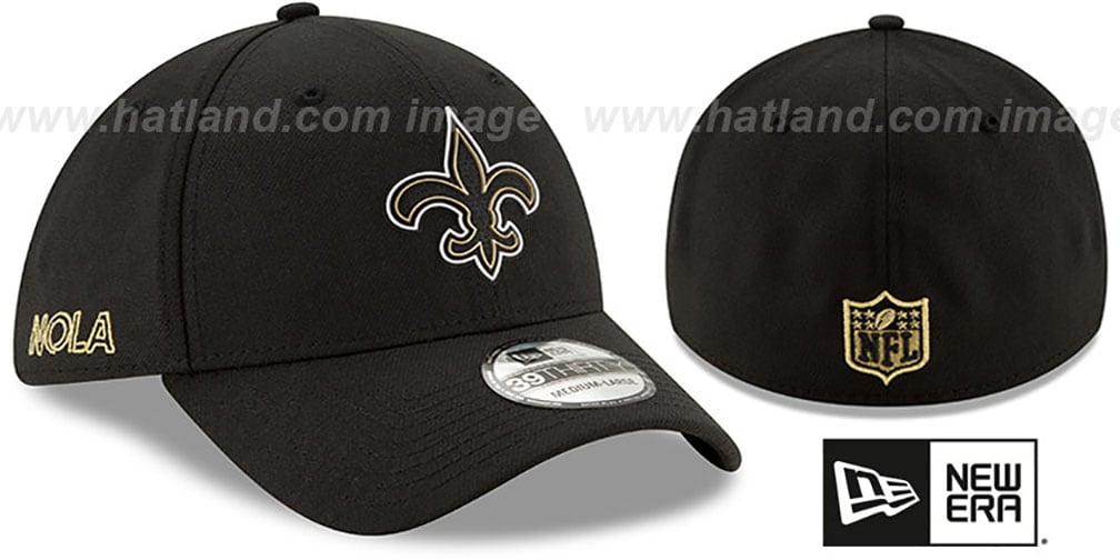 New Era 39THIRTY stretch fit hat with black authentic poly blend crown and visor, black undervisor, raised silicone team logo attached to front, embroidered team slogan on side, embroidered New Era logo on opposite side, raised embroidered NFL shield logo on back in team colors This Flex 39THIRTY hat fits approximate head sizes (Sm / Med 6 7/8 - 7 1/4) (Med / Lg 7 1/4 - 7 5/8) (Lg / XLg 7 5/8 - 8 ). This New Orleans Saints hat is made by New Era and is licensed by the NFL - National Football League.