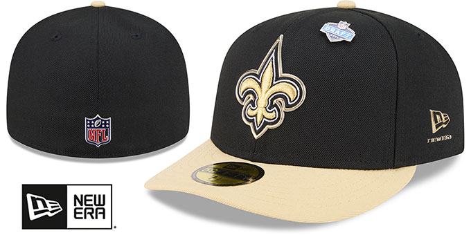 Authentic and ORIGINAL 59FIFTY fitted performance poly hat by New Era, black rounded crown with old gold (tan) slightly precurved visor and 2026 NFL Draft pin on crown, light grey undervisor, red-white-blue stars and stripes print on inside front panels, embroidered team logo on front with liquid chrome outline, liquid chrome New Era logo on side, liquid chrome NFL shield logo on back, This is the Low Crown fitted style of hat worn by all NFL players during the 2026 NFL Draft. This New Orleans Saints baseball cap is made by New Era and is licensed by the NFL - National Football League.