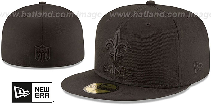 This New Era 59Fifty fitted cap features a deep black poly or wool crown and visor, with a light grey undervisor. The front showcases a raised, all-black embroidered team logo, while the side bears a black embroidered New Era logo. The back displays a black raised embroidered NFL shield logo, making this an authentic and original cap. This New Orleans Saints hat is made by New Era and is licensed by the NFL National Football League.