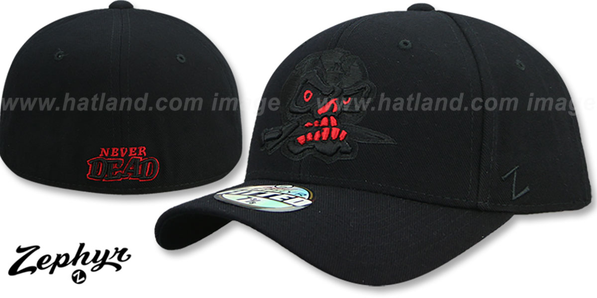 low profile structured 6 panel hat, black wool blend crown and visor with black undervisor, raised embroidered team logo on front in black with red eyes-nose-teeth, black button and eyelets, matching embroidered Never Dead logo on back. This San Cristobal Pirates hat is made by Zephyr and is licensed by the NCAA College.