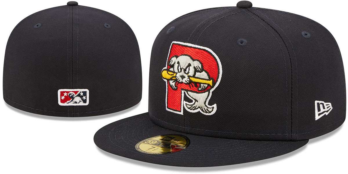 Authentic and ORIGINAL 59FIFTY onfield poly fitted hat by New Era, dark navy blue deep crown and visor, black undervisor, embroidered Portland Sea Dogs Minor League onfield team logo on front, New Era logo on side, matching raised embroidered MiLB Minor League logo on back, These hats are the Authentic Onfield hats worn during Minor League games, they are the Double-A affiliate of the Boston Red Sox. This Portland Sea Dogs baseball cap is made by New Era and is licensed by the MiLB - Minor League Baseball.
