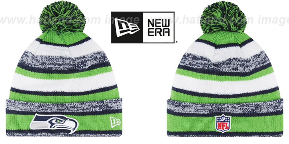 Lime green , white, and navy blue acrylic ribbed knit crown, embroidered team logo on front, soft light grey poly/wool flannel liner, matching two color pom-pom on top, small New Era Flag embroidery on side, embroidered NFL shield logo on back. This Seattle Seahawks hat is made by New Era and is licensed by the NFL National Football League.
