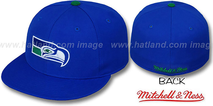 'Authentic' wool fitted hat by Mitchell & Ness with original cut and flat brim, royal blue crown and visor with secondary color undervisor, old school Throwback team logo embroidery on front, Mitchell & Ness script embroidery on back. This Seattle Seahawks hat is made by Mitchell & Ness and is licensed by the NFL - National Football League.