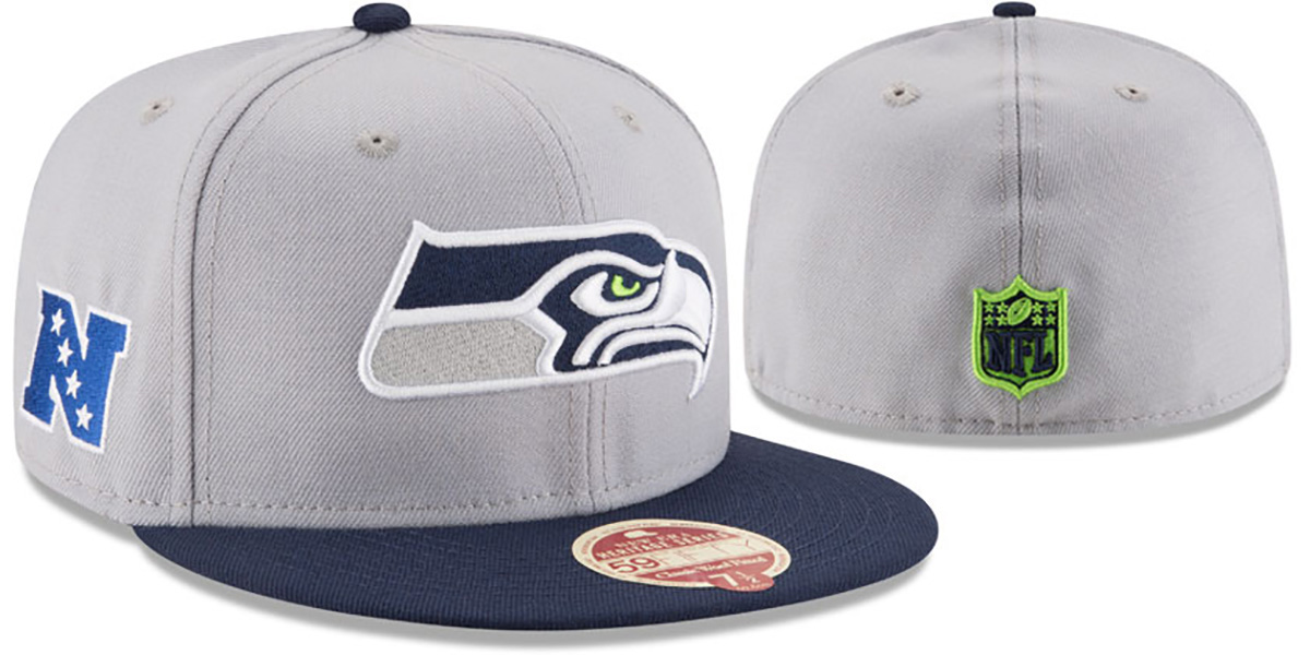Authentic and ORIGINAL 59Fifty wool fitted hat by New Era from the HERITAGE SERIES, light grey deep crown with navy blue visor, grey undervisor, raised embroidered team logo on front, embroidered NFC logo on side, New Era logo on opposite side, matching embroidered NFL Shield logo on back. This Seattle Seahawks hat is made by New Era and is licensed by the NFL National Football League.