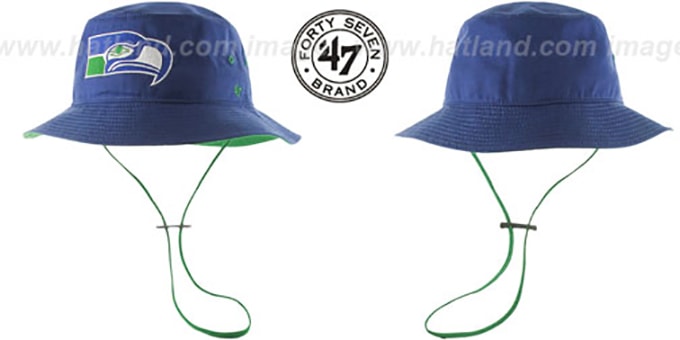 Cotton Twill Bucket hat, royal blue crown and brim, kelly green undervisor and drawstring and eyelets, embroidered Throwback team logo on front, One Size Fits Most Fits, Approximate Sizes 7 1/8 thru 7 5/8. This Seattle Seahawks hat is made by 47 Brand and is licensed by the NFL National Football League.