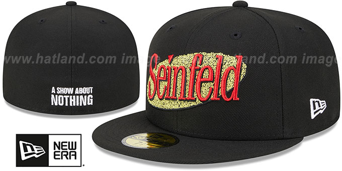 Authentic and ORIGINAL 5950 fitted hat by New Era, black authentic poly crown and visor, light grey undervisor, embroidered Seinfeld logo on front in red with metallic gold, embroidered A SHOW ABOUT NOTHING on back, officially licensed Seinfeld hat produced by New Era. This Seinfeld hat is made by New Era and is licensed by the New Era Brand.
