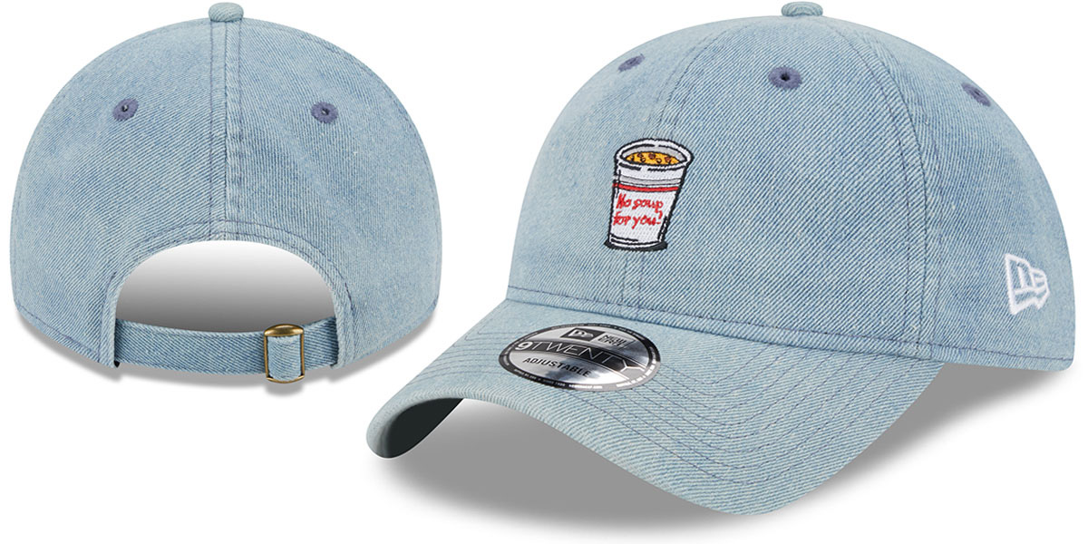 Low Profile 9TWENTY slouch fit cotton hat by New Era, light denim blue Garment Washed unstructured rounded crown and visor, matching light denim blue undervisor, embroidered No Soup For You cup on front, embroidered New Era logo on side, matching adjustable strapback with slide buckle loop closure, officially licensed Seinfeld hat produced by New Era. This Seinfeld hat is made by New Era and is licensed by the New Era Brand.