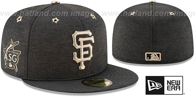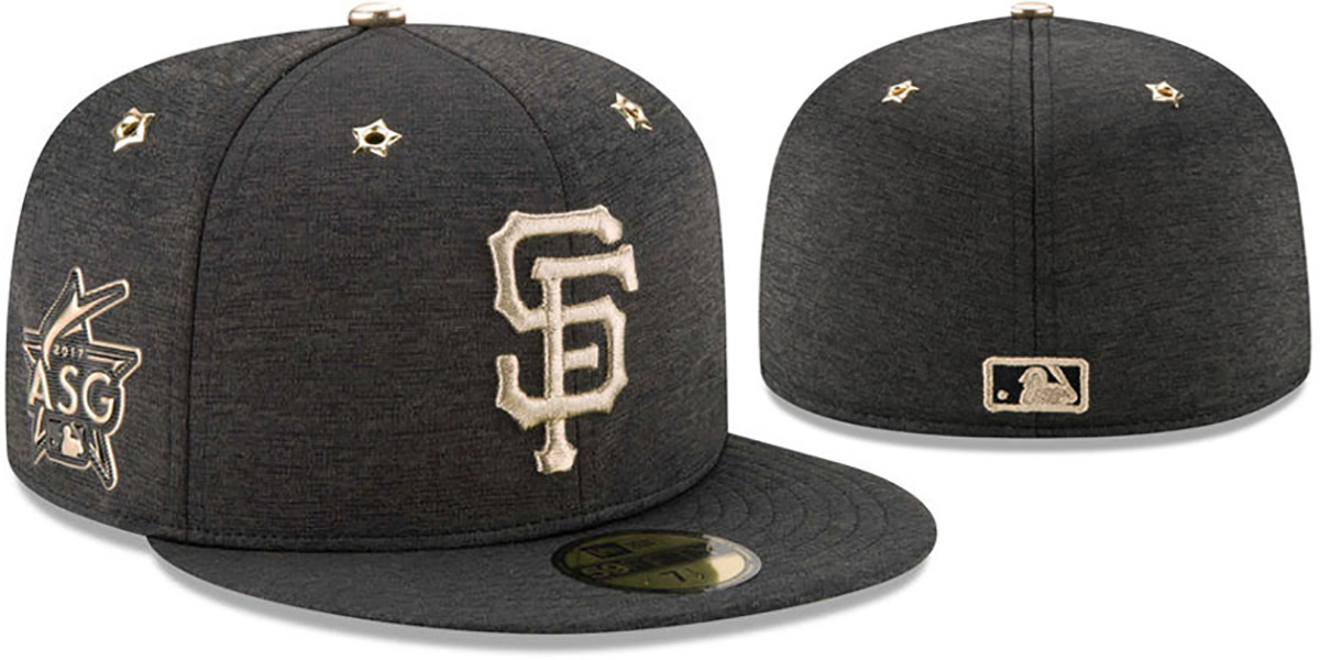 LIMITED QUANTITIES, Orders now shipping!!, Authentic and ORIGINAL 59FIFTY fitted onfield poly hat by New Era, black heather tech deep crown and visor, black undervisor, raised embroidered team logo on front in metallic gold, gold star rivets on each eyelet, matching 2017 All-Star logo patch on side, matching embroidered New Era logo on opposite side, matching raised embroidered MLB logo on back, This is the hat worn during 2017 All-Star Game in Miami FL. This San Francisco Giants baseball cap is made by New Era and is licensed by the MLB - Major League Baseball.