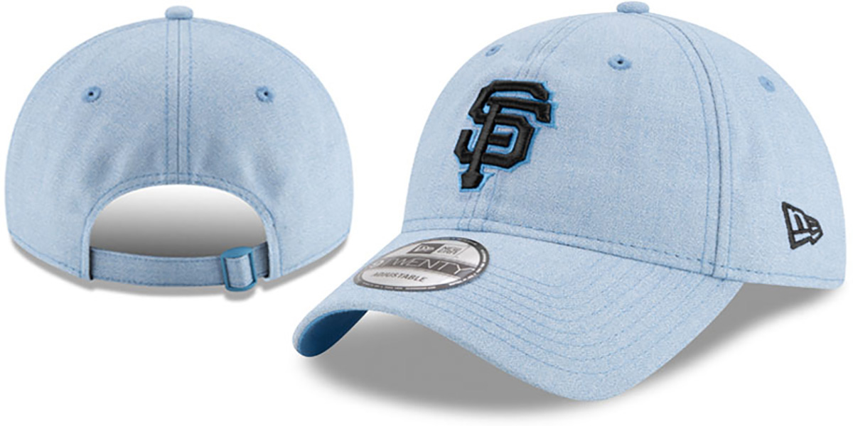 LIGHTLY STRUCTURED and LOW PROFILE 9TWENTY authentic poly hat, shadow tech heather sky (light) blue crown and visor, solid sky blue undervisor, matching raised embroidered team logo on front, embroidered New Era logo on side, matching adjustable strap with New Era slide loop closure, GREAT HAT IF YOU WANT YOUR HAT BROKEN IN LIKE IT IS PRE-WORN!, Official MLB hat produced for the 2018 Father's Day games. This San Francisco Giants hat is made by New Era and is licensed by the MLB - Major League Baseball.