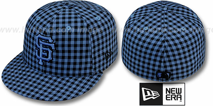 Authentic and ORIGINAL 59FIFTY fitted hat by New Era, sky blue and black cotton Buffalo Gingham Plaid deep crown and visor, black undervisor, sky blue raised embroidered team logo on front with black outline, matching MLB logo on back. This San Francisco Giants baseball cap is made by New Era and is licensed by the MLB - Major League Baseball.
