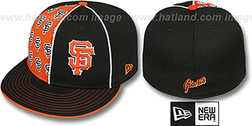 'Authentic' and ORIGINAL 59FIFTY fitted hat by New Era, black cotton twill deep crown and visor with white 'DOWN FEATHER' print All-Over deep crown and visor, black undervisor, raised embroidered team logo on front in white, matching embroidered MLB logo on back. This San Francisco Giants baseball cap is made by New Era and is licensed by the MLB - Major League Baseball.