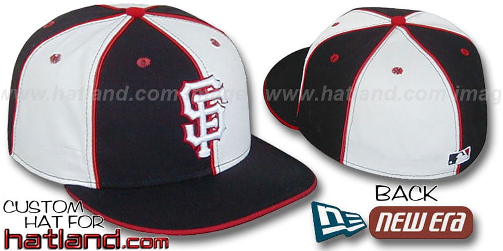 'Authentic' New Era ORIGINAL 5950 fitted hat, black and white alternating panels-black visor with red flip, red piping on all seams, raised embroidered 'SF' team logo on front and matching MLB logo on back.NEFPW3sangia-blkwht. This San Francisco Giants hat is made by New Era and is licensed by the MLB - Major League Baseball.