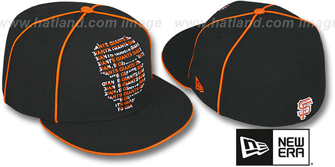 'Authentic' and 'Original' 59FIFTY fitted hat by New Era, black wool deep crown and and visor, oversized New Era Exclusive 'MONIKER BIG-ONE' embroidered team logo on front with small repeating team name in team colors, orange undervisor and flip, orange piping on mid seams, team logo on rear of hat.. This San Francisco Giants baseball cap is made by New Era and is licensed by the MLB - Major League Baseball.