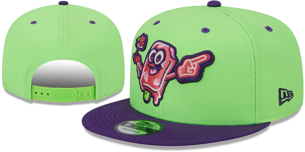 Authentic 9FIFTY snapback hat by New Era with a similar fit, lime green authentic poly crown and purple visor, black undervisor, embroidered Beloit Sky Carp Minor League New Era EXCLUSIVE COPA Lime Las Paletas team logo on front, New Era logo on side, matching adjustable snapback closure, These hats are the snapback version of the hats that will be worn during select Minor League games, they are the Minor League affiliate of the Miami Marlins. This Beloit Sky Carp hat is made by New Era and is licensed by the MiLB - Minor League Baseball.