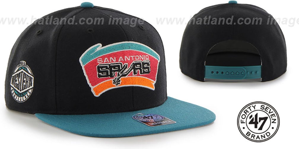 Authentic wool blend adjustable hat by Twin 47 Brand with original cut and flat brim, black crown and team color teal visor, light grey undervisor, raised embroidered team logo on front, matching embroidered Conference logo embroidered on side, matching adjustable plastic Snapback strap closure. This San Antonio Spurs hat is made by 47 Brand and is licensed by the NBA - National Basketball Association.
