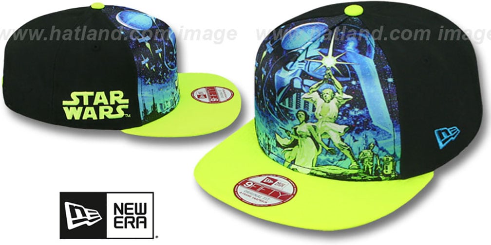Authentic poly twill adjustable hat by New Era with 9FIFTY A-Frame original cut and flat brim, black crown with Hi-Res STAR WARS collage print on front panels, bright yellow visor and undervisor, New Era flag on side, matching embroidered STAR WARS logo on opposite side, adjustable plastic snapback strap. This hat is made by New Era.