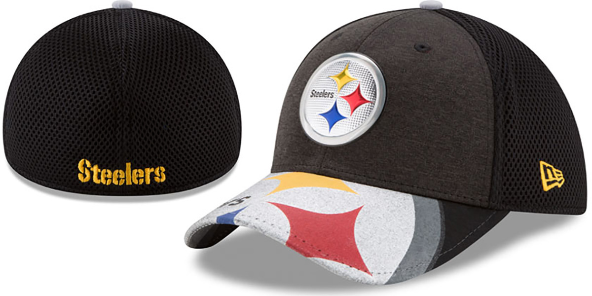 New Era 39THIRTY authentic poly stretch fit hat, black shadow tech crown with black neo-mesh middle and back panels, pre-curved printed poly visor with team logo on top and team font logo on undervisor, Liquid Chrome foil team logo on front, embroidered New Era logo on side, embroidered secondary team logo on back, This Flex 39THIRTY hat fits approximate head sizes (Sm / Med 6 7/8 - 7 1/4) (Med / Lg 7 1/4 - 7 5/8) (Lg / XLg 7 5/8 - 8 ), The 39THIRTY Flex hat worn during the 2017 NFL Draft. This Pittsburgh Steelers hat is made by New Era and is licensed by the NFL - National Football League.