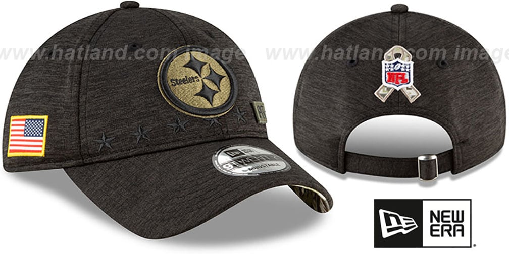 Authentic poly 9TWENTY hat by New Era, black shadow tech (heathered black) crown and pre-curved visor with DIGITAL desert storm camouflage camo undervisor and black headband, raised embroidered team logo on front in military moss green and black over matching team initial patch, embroidered New Era logo on side, embroidered matching USA Flag applique on opposite side, matching embroidered NFL shield logo on back with digital camo military ribbon above matching strap with brass slide loop closure This is the adjustable curved brim style of hat worn by all NFL teams played on Salute to Service 2020 weeks. These commemorative caps honor our Armed Forces through patriotic themes that remind us all of the dedication of our troops. All proceeds from the NFL’s Salute to Service campaign are donated to the NFL’s three military appreciation nonprofit partners: USO, Pat Tillman Foundation, and Wounded Warrior Project. This Pittsburgh Steelers hat is made by New Era and is licensed by the NFL National Football League.