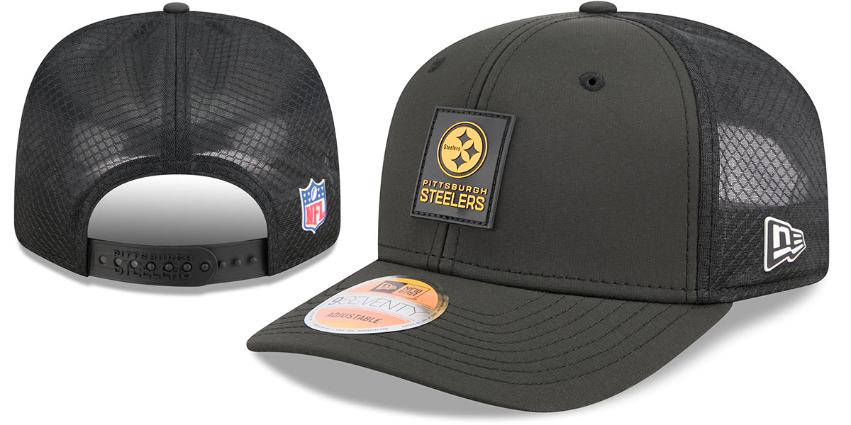 This Authentic New Era Low Profile 9SEVENTY Snapback is the official 2025 NFL Sideline cap worn by players, coaches, and staff. Designed with a structured black water-repellent Quill Tech crown, curved visor, and breathable mesh back panels. Features a quick-dry cushioned sweatband for comfort, silicone team logo patch on the front, jersey stripe applique under the brim, silicone New Era flag on the side, NFL Shield on the back, and an adjustable snapback closure.. This Pittsburgh Steelers hat is made by New Era and is licensed by the NFL - National Football League.