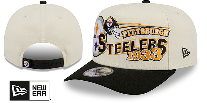 Adjustable A-FRAME five panel hat by New Era with pinched seam on front panels, chrome (cream) authentic poly crown and black visor with throwback dark kelly green undervisor, team classic logo flat embroidery on front across front panels, embroidered New Era logo on side, matching adjustable Snapback closure with team hangtag. This Pittsburgh Steelers hat is made by New Era and is licensed by the NFL - National Football League.